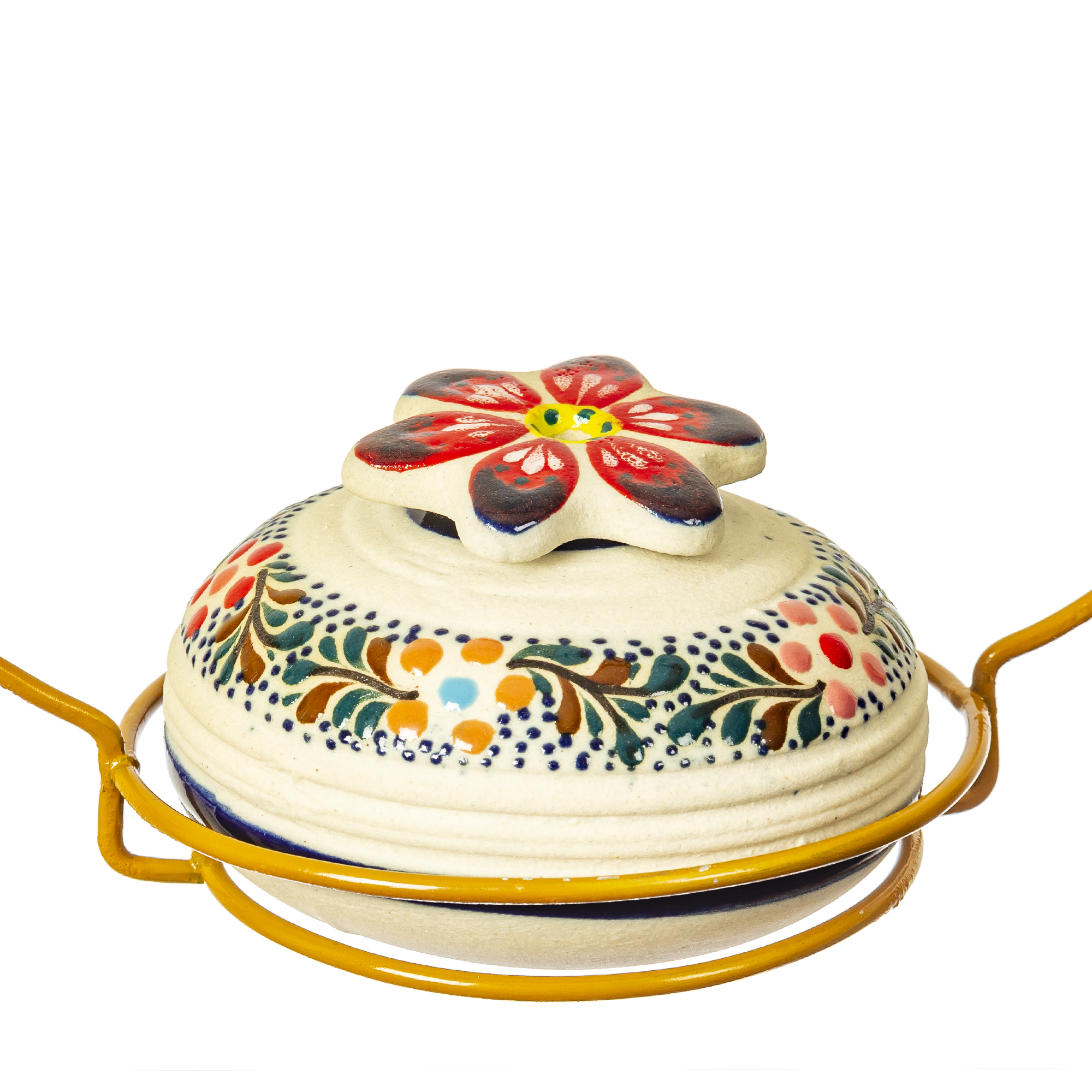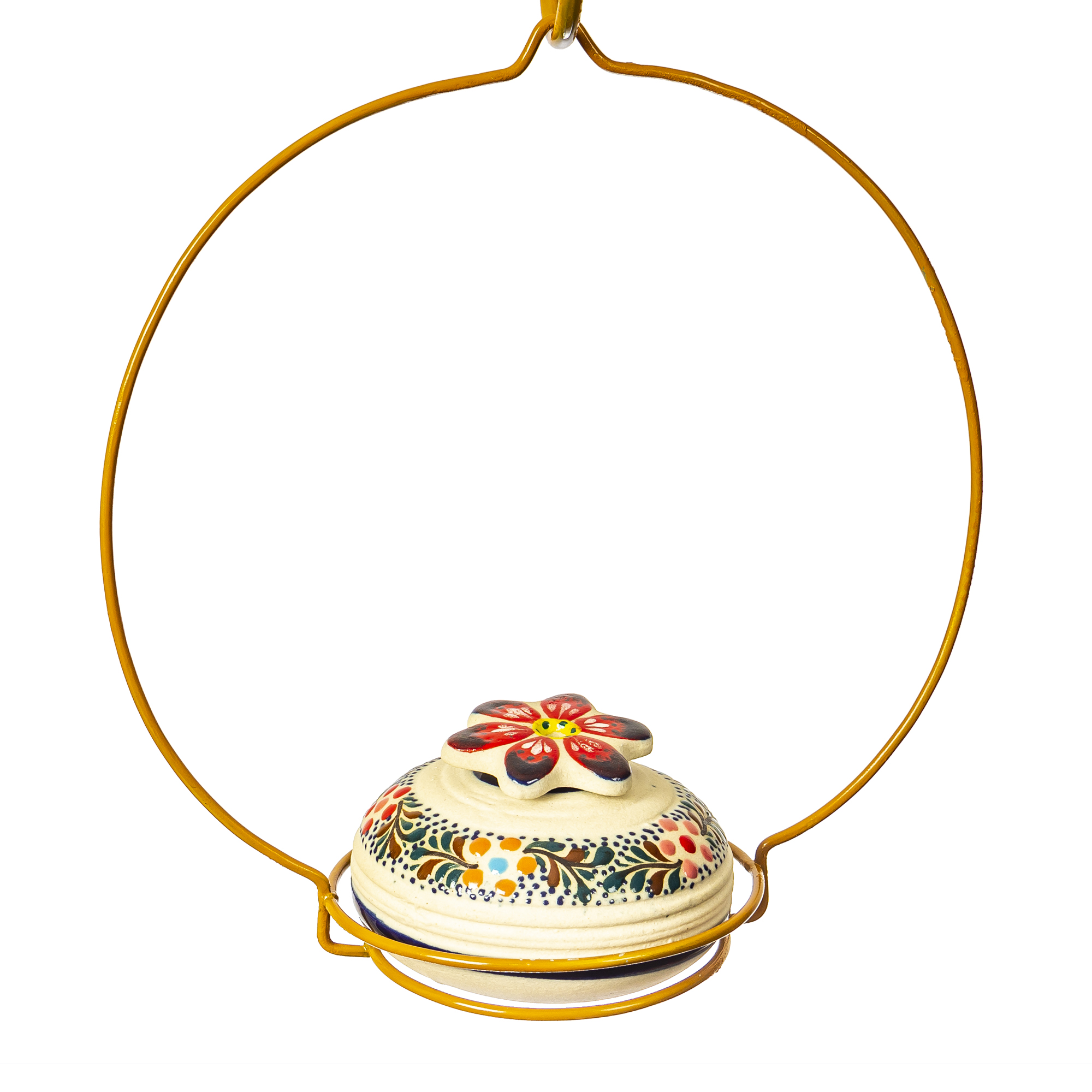 Bebedero para Colibrís, elaborado en cerámica de alta temperatura (Gres), pintado a mano Técnica en relieve en colaboración con artista del taller de Pájaros en Guanajuato; capacidad 3 Oz,