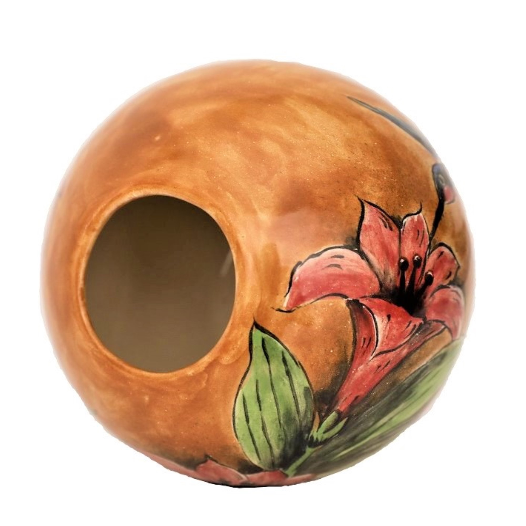 Pajarera para aves en libertad; Pieza artesanal elaborada en barro y pintada a mano técnica Mayólica en colaboración con artistas de Santa Rosa de Lima, Gto. México, medidas 14 x 11cm