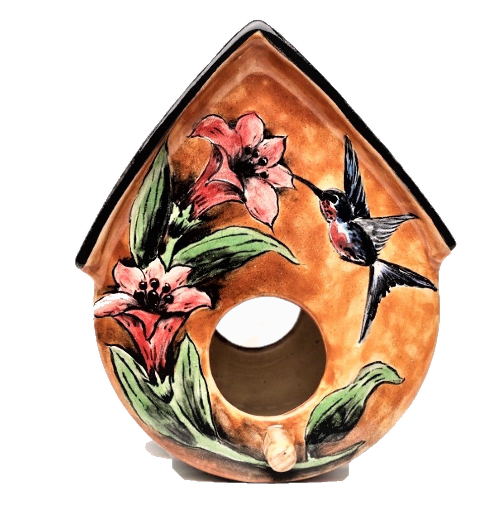 Pajarera para aves en libertad; Pieza artesanal elaborada en barro y pintada a mano técnica Mayólica en colaboración con artistas de Santa Rosa de Lima, Gto. México, medidas 17 x 20 x 13cm