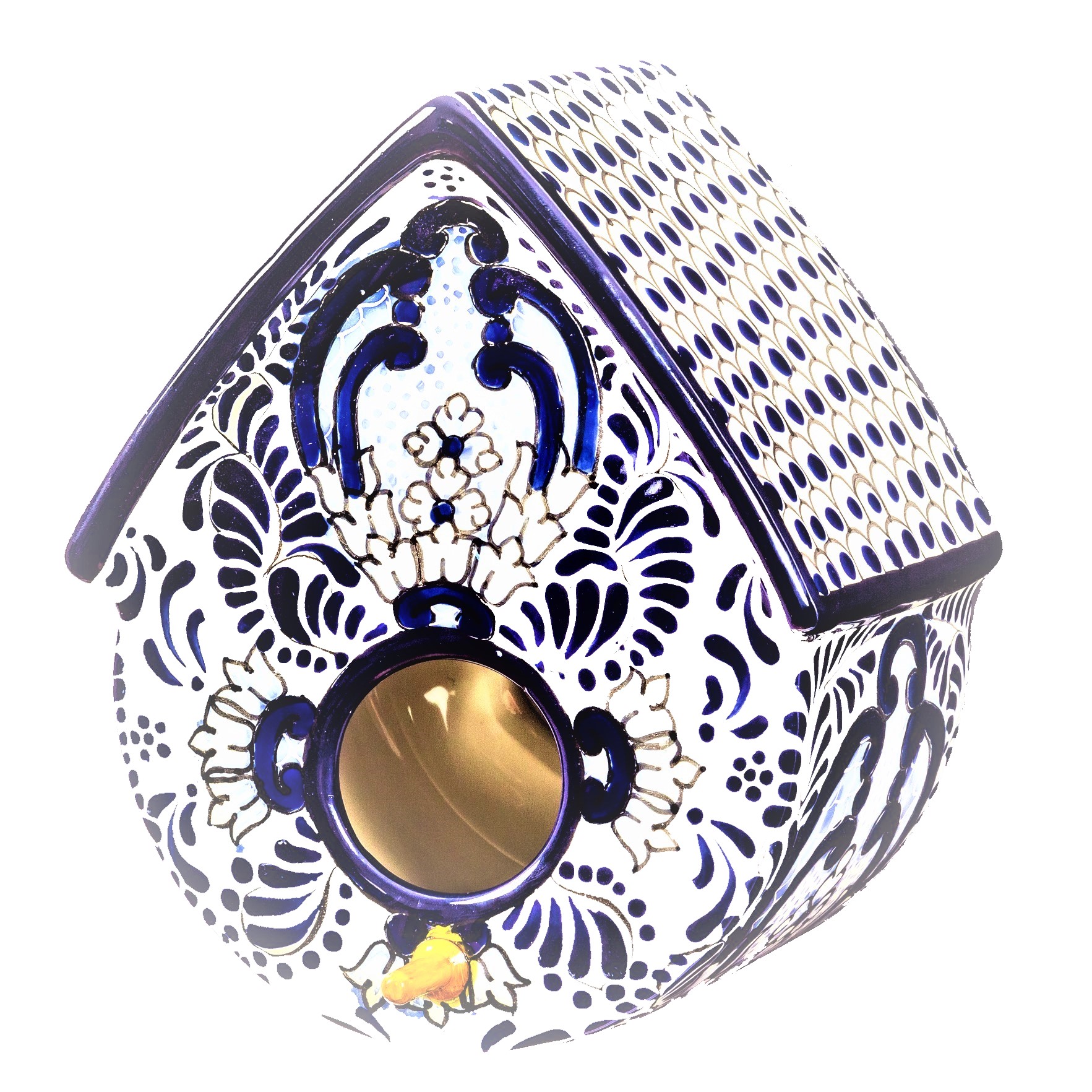 Pajarera elaborada en Barro, decorada a mano técnica Talavera, por artista del Taller de Talavera Talaeca en el estado de Puebla, México, medida 20 cm alto