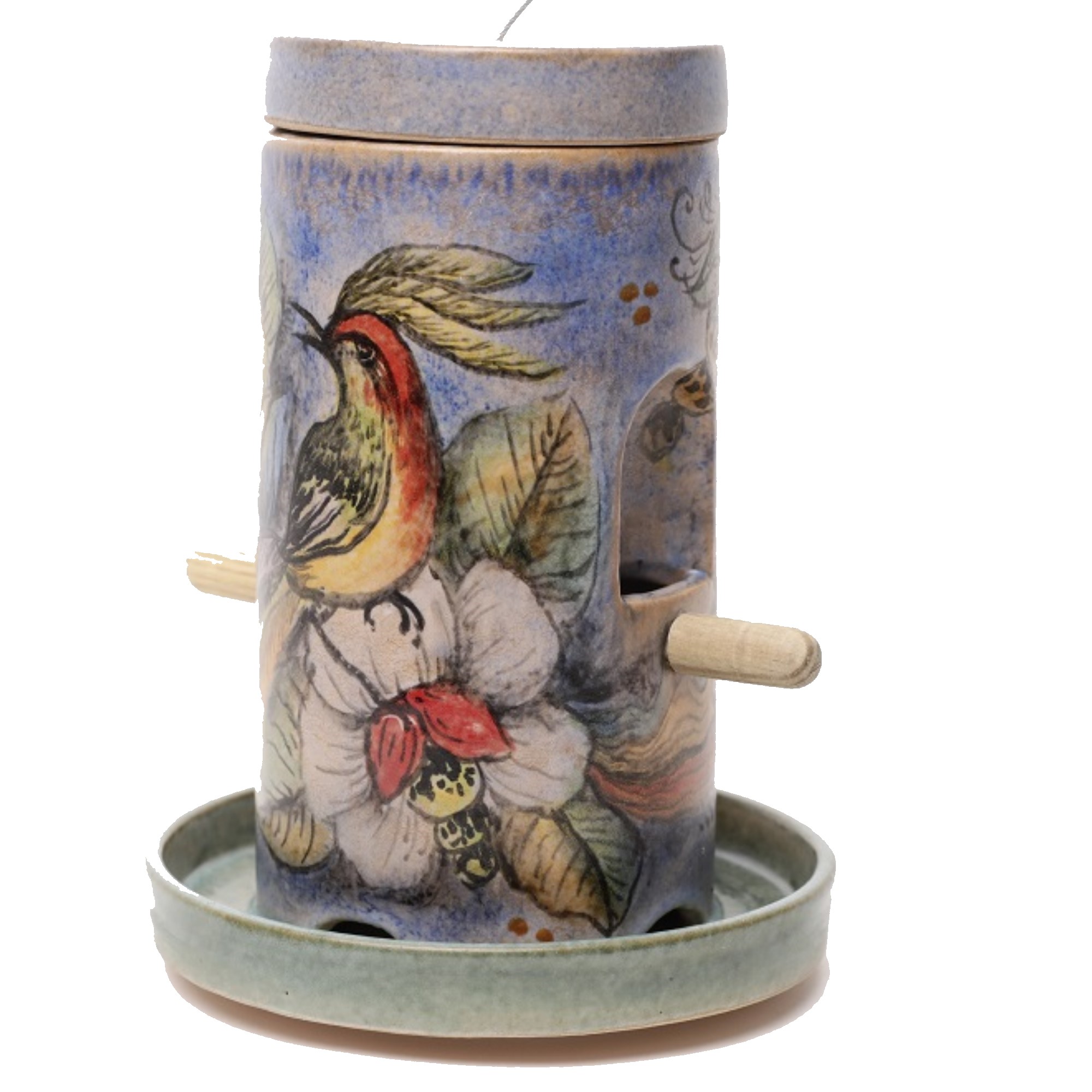 Comedero para aves en libertad, Pieza artesanal, elaborada en barro y pintada a mano técnica Mayólica en colaboración con artistas de Santa Rosa de Lima, Gto. México, medidas 20 X 15 cm